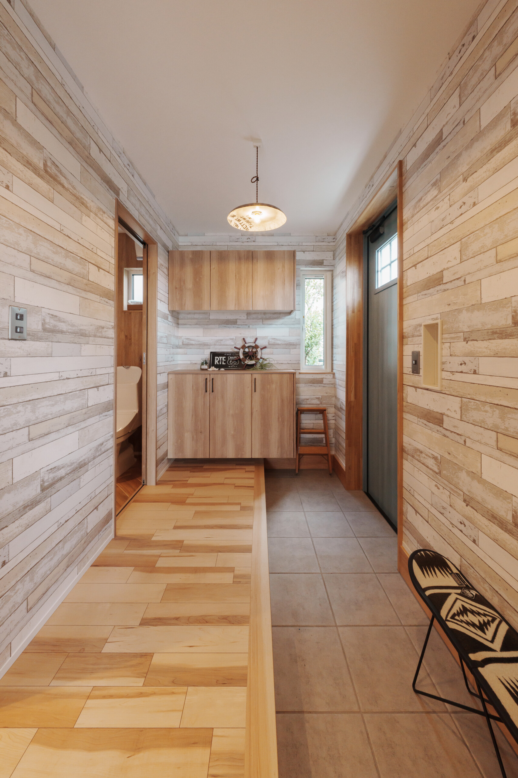 外のウッドデッキでは、家族や友人とバーベキューを楽しむこともできます。リビングの壁には、杉板をヘリンボーン貼りで仕上げ、マリンランプを取り付けてスタイリッシュな印象に。照明にもこだわり、海の浮きガラスを思わせるペンダントライトや、水面の陰影を表現したデザイン照明など、マリンテイストを随所に散りばめました。