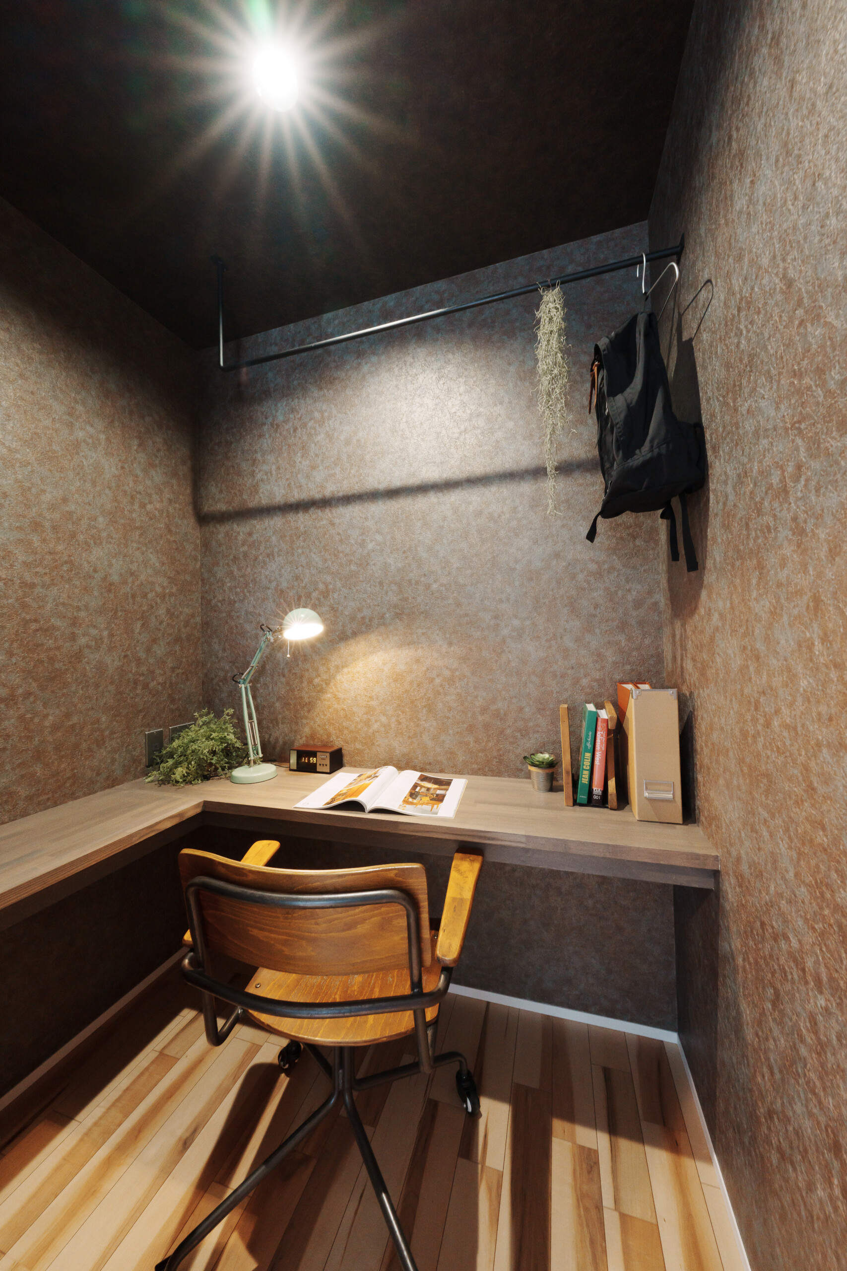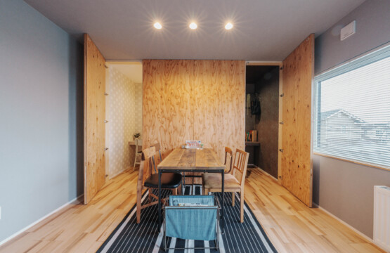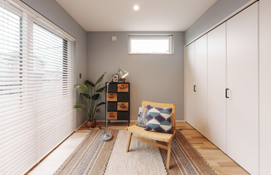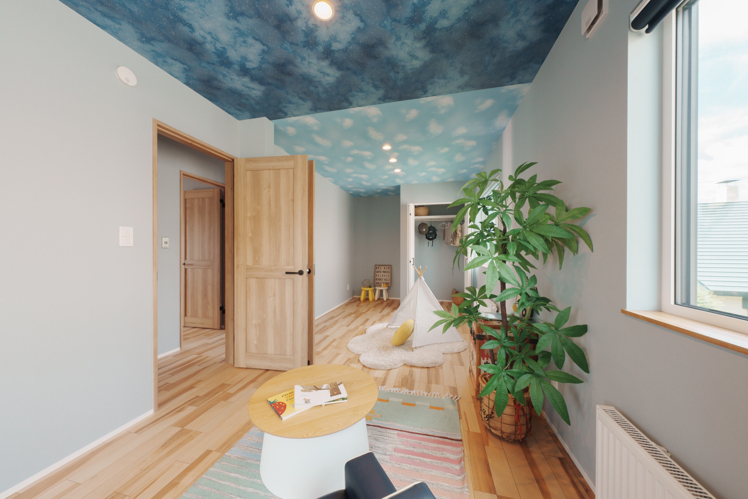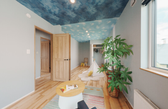 主寝室には、ふたつの隠し部屋を設けて遊び心をプラス。お子様のお部屋は「千と千尋の神隠し」に登場する“坊の部屋”をイメージし、昼と夜を表すクロスで個性的に仕上げています。ご入居後には、太陽のオブジェが加わり、より物語のある空間へと完成予定です。