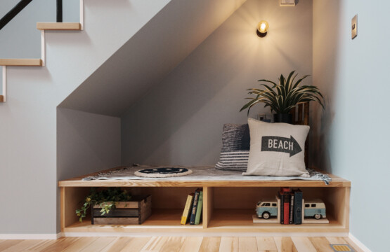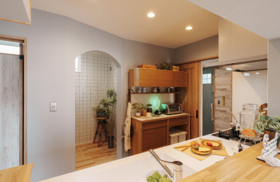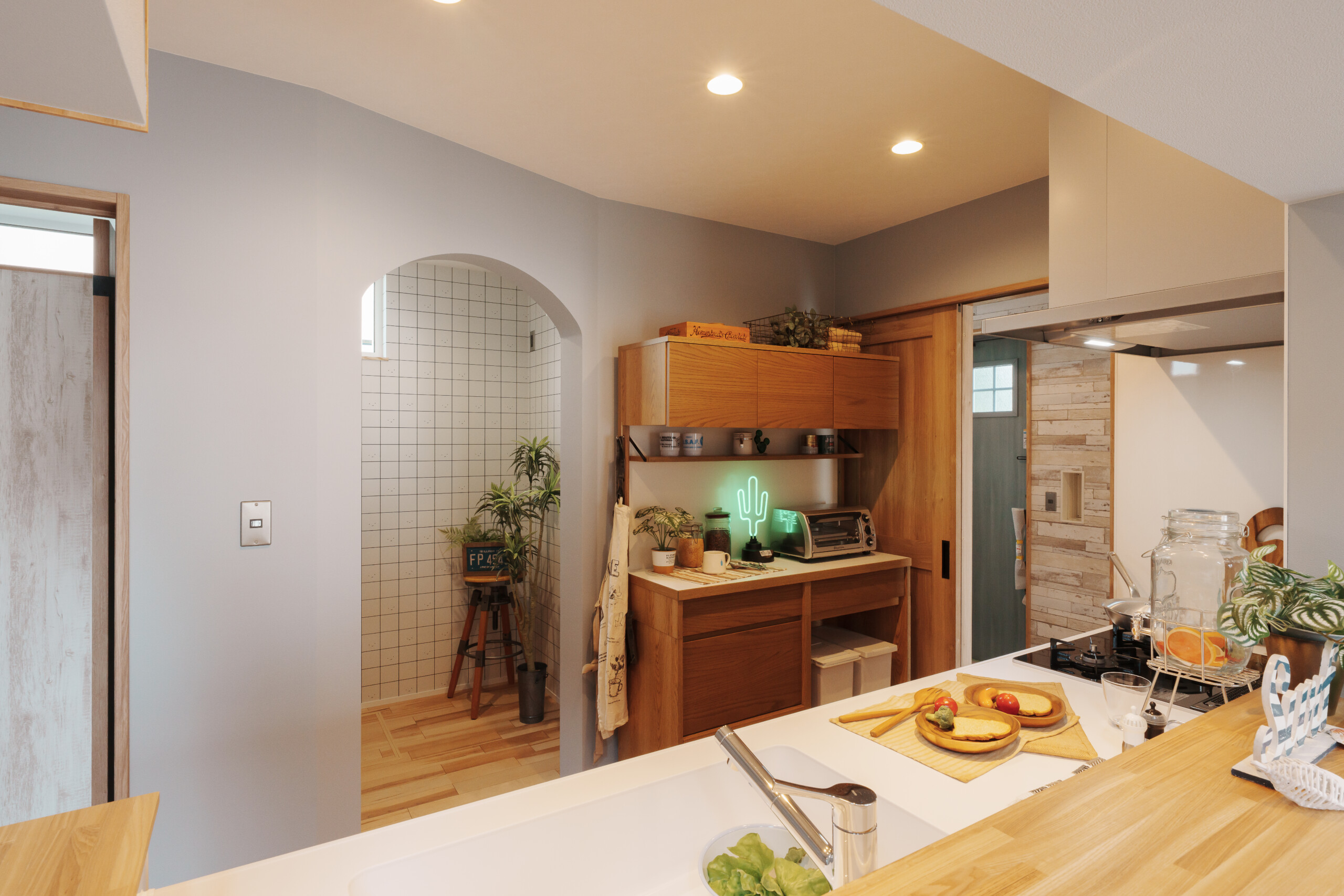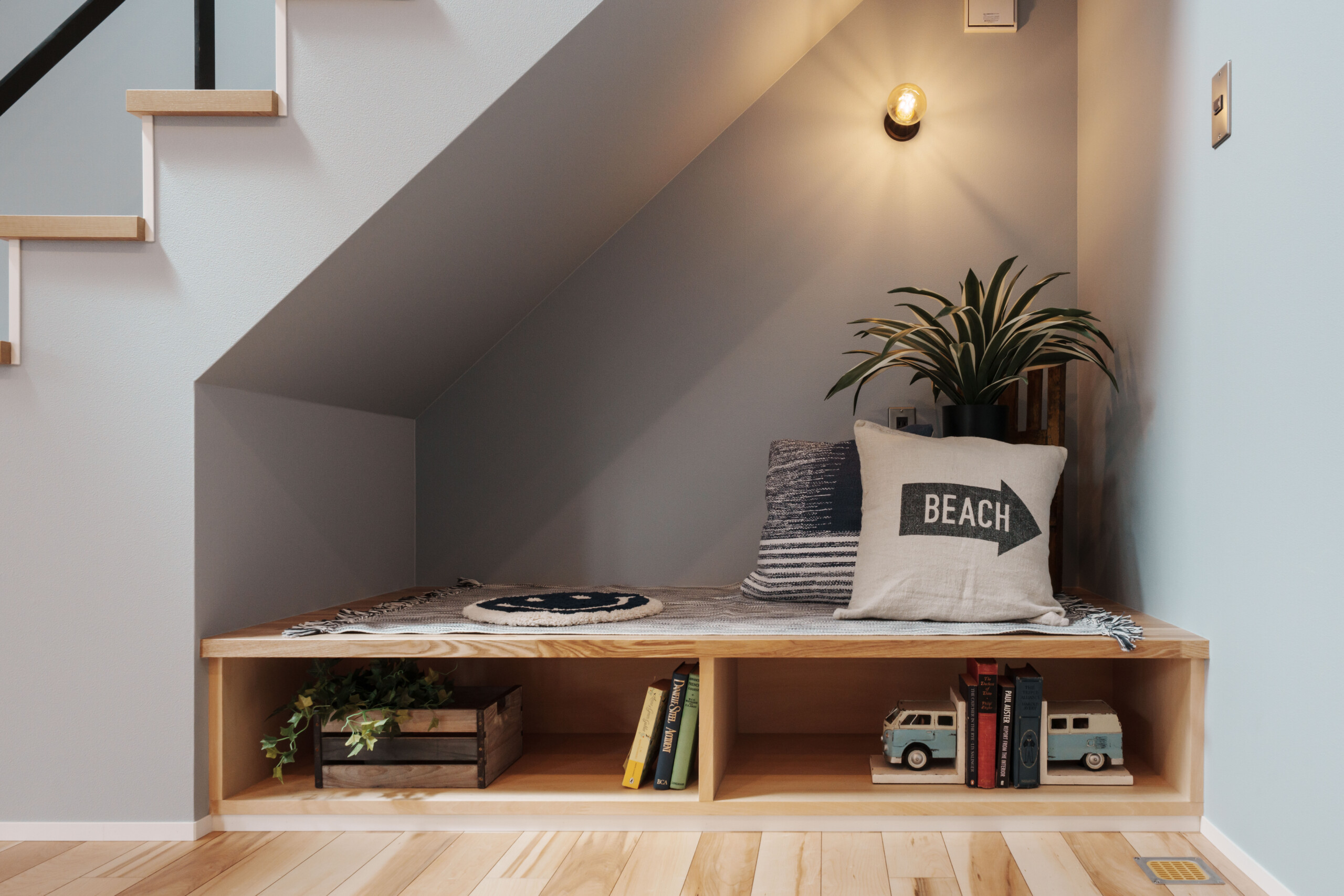 キッチンは、軒のようなデザインの下がり壁で「海の家」を思わせる雰囲気に。階段下のヌック(こもりスペース)は、お昼寝や読書にぴったりのくつろぎ空間です。