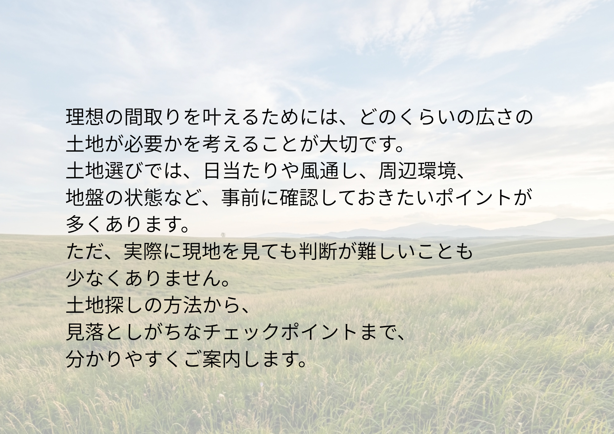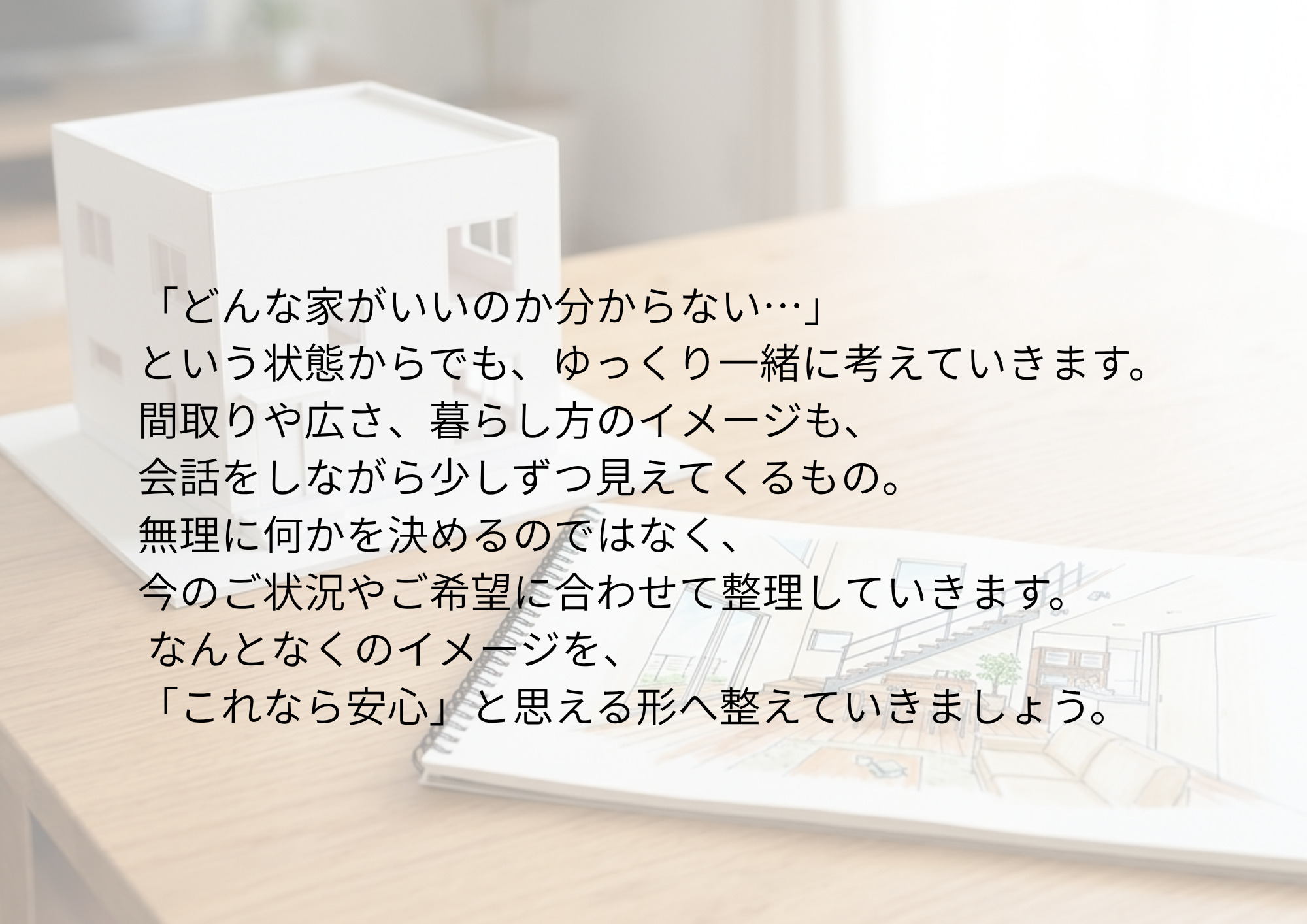 間取り・広さ・暮らし方など、なんとなくのイメージを整理しながら、あなたに合った方向性を見つけていきます。