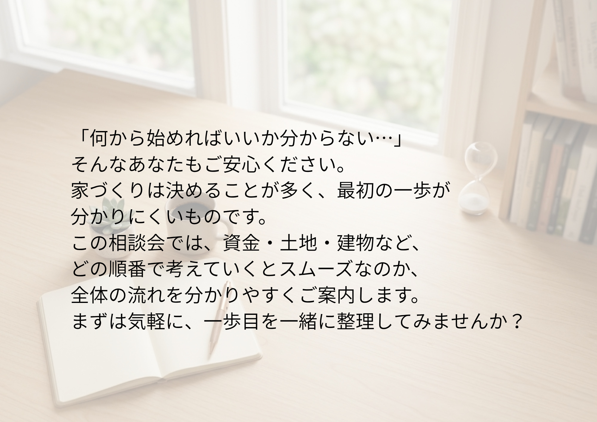 家づくりの流れを整理しながら、今やるべきこと・まだ考えなくていいことをお伝えします。