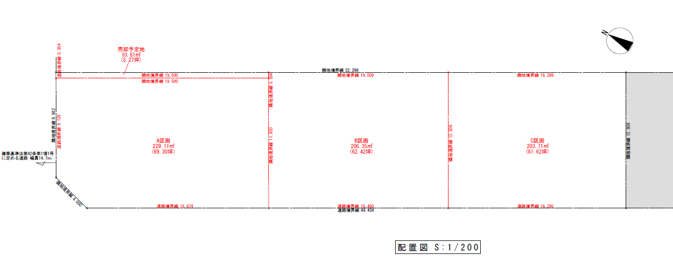 接道状況 A:①北西側幅員14.7mの公道に9.12m接道 ②西側幅員14.8mの公道に16.67m接道 B:西側幅員14.8mの公道に16.49m接道 C:西側幅員14.8mの公道に16.29m接道 私道面積